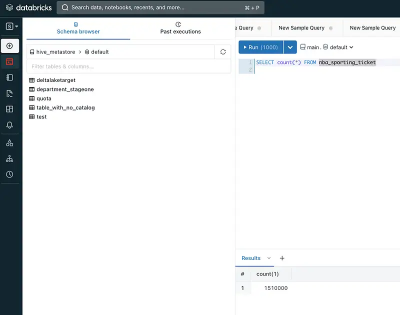 If the Total Output and Input values are equal, it indicates the successful migration of Oracle data to the Databricks catalog. To further validate the completeness of the migration, execute the following query in the Databricks editor to verify the total count of our NBA_SPORTING_TICKET table: