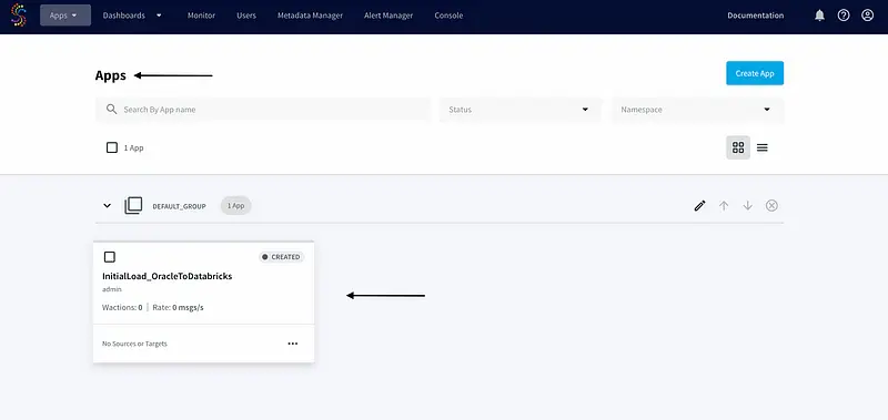 To verify that it was created successfully, we will log in to the Striim console and go to the “Apps” page: