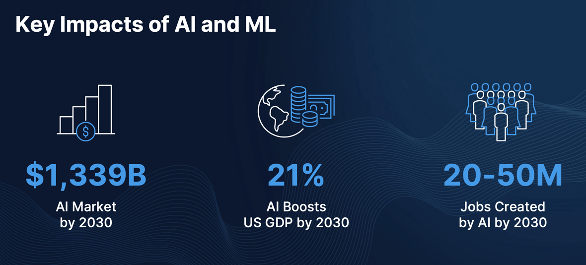 AI and ML are more than just buzzwords; they are driving substantial economic growth, creating new job opportunities, and shaping the future. The AI market is projected to reach a staggering $1,339 billion by 2030. This exponential growth underscores the widespread adoption and integration of AI across various industries. Furthermore, AI is on track to boost the US GDP by 21% by 2030. This highlights the profound economic impact AI will have. By automating routine tasks, optimizing operations, and providing deep insights through data analysis, AI enables businesses to increase productivity while reducing costs. And contrary to common fears that AI will eliminate jobs, it is expected to create 20-50 million positions by 2030. These roles will span various sectors, including data science, AI ethics, machine learning engineering, and AI-related research and development.