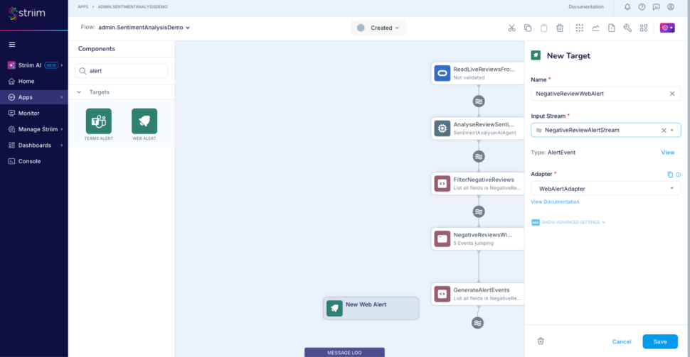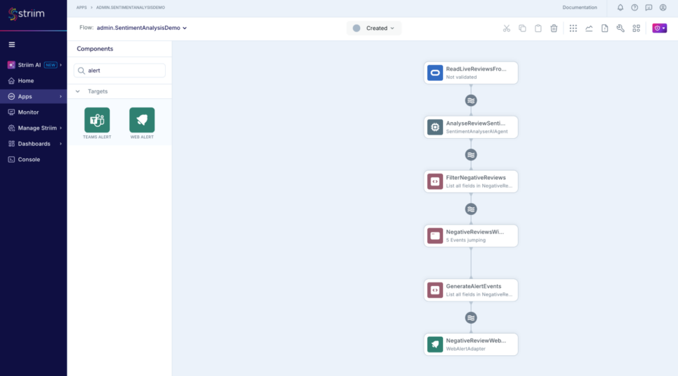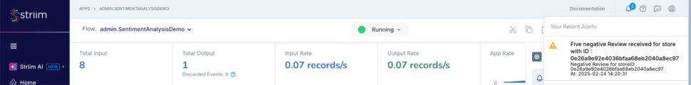 - Generate real time notifications using Striim Alert manager if the number of negative reviews exceeds the threshold values and transform them into actions for the business.