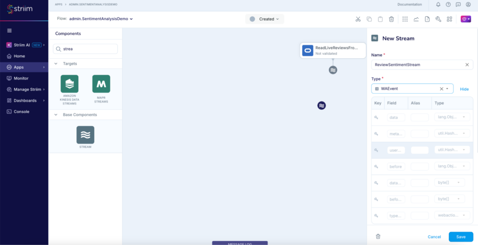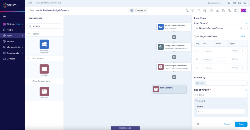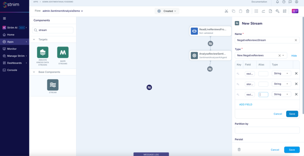 Striim eliminates these challenges by providing a fully integrated streaming, transformation, and AI processing platform that ingests, processes, and analyzes sentiment in real-time with minimal setup.