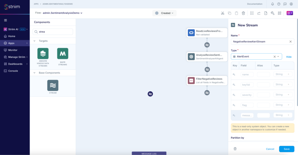 Step 8: Add another stream NegativeReviewAlertStream of type AlertEvent to use for the alert subscription.