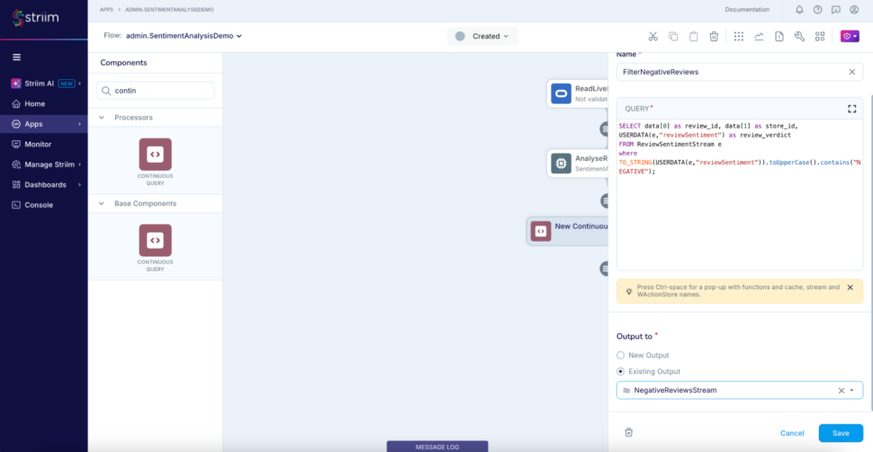Step 6: Add a CQ that takes input from the ReviewSentimentStream, filters and outputs only the negative reviews to the stream we just created – NegativeReviewsStream.