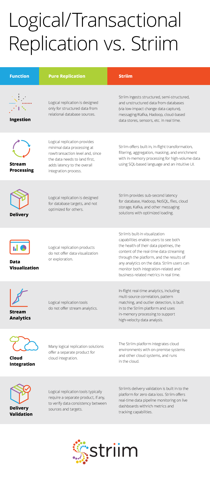 In Striim, there are several ways to enabling the same workload. Striim allows data to be directly read from files and also from Kafka topics thereby preventing a complete IO cycle.